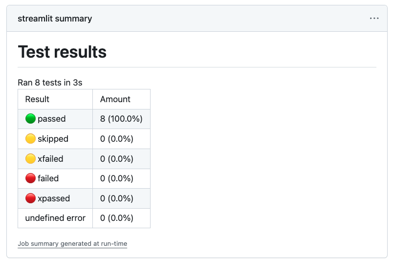For higher-level test results, you can use pytest-results-action. You can combine this with Streamlit App Action as follows: